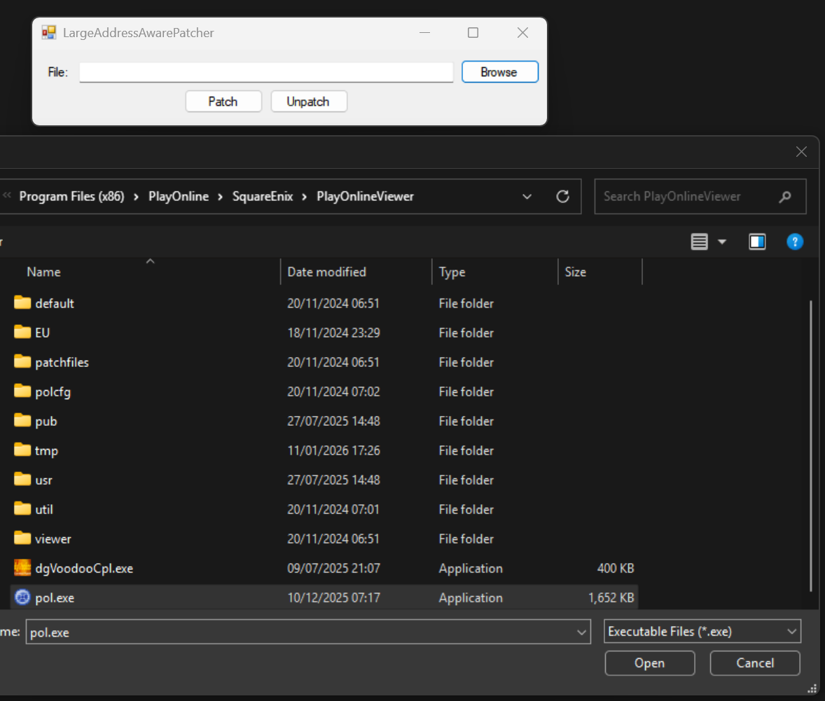C:\Program Files (x86)\PlayOnline\SquareEnix\PlayOnlineViewer, click onpol.exewithin the folder and then clickPatch.